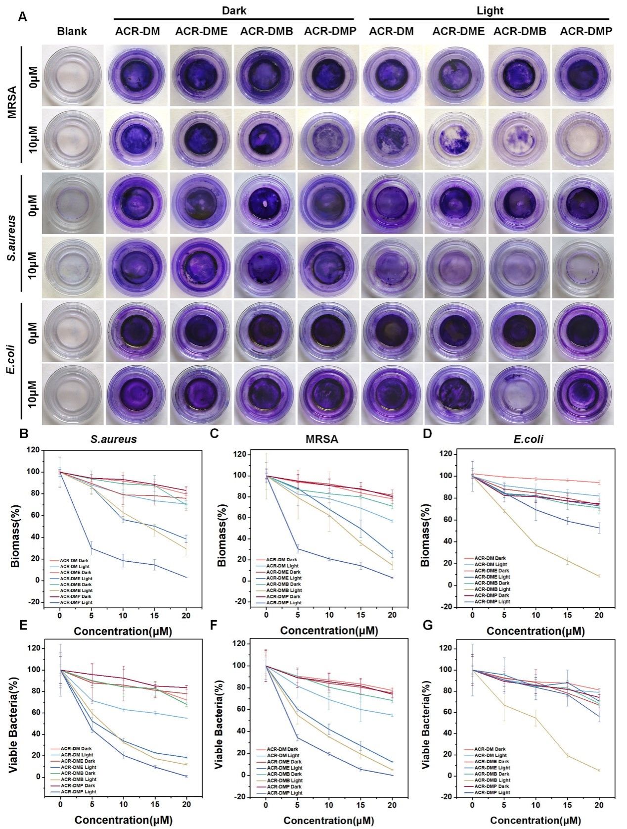 探究了其抗浮游细菌性能(图3),未阳离子功能化的光敏剂(ACR-DM)几乎不能杀死任何细菌。随着修饰正电荷数量的增加,抗菌性能明显提高,单个正电荷的ACR-DME可有效杀灭革兰氏阳性菌,两个正电荷的ACR-DMB对阳性菌和阴性菌均表现出高效的抗菌性能。而硼酸修饰的ACR-DMP具有最优异的抗阳性菌潜力。在光照下,2.5 μM ACR-DMP 消灭了近 100% 的 MRSA。