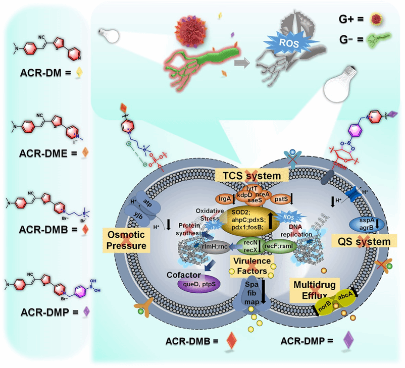 在此基础上,该团队在质膜靶向抗菌的理念指导下,通过调节正电荷数目和多糖靶向的硼酸基团提高质膜结合能力和EPS渗透性,设计合成系列I型PS(ACR-DM、ACR-DME、ACR-DMB和ACR-DMP)。合适的D-A体系可以减少激发的三重态和基态之间的能隙,阻止与氧气的能量交换过程,从而通过电子转移促进I型ROS的产生,有效克服生物膜缺氧微环境。其中ACR-DMP修饰了硼酸基团,可与细胞壁、EPS 和质膜糖蛋白中丰富的多糖中存在的顺二醇基团高效结合,不仅可以增强生物膜的结合和清除活性,还抑制信号转导系统和外排泵,有效避免耐药性的产生,抑制生物被膜的复发。(图1)