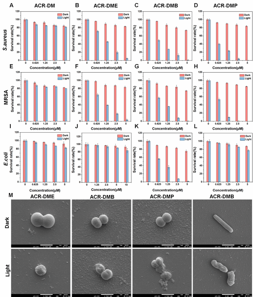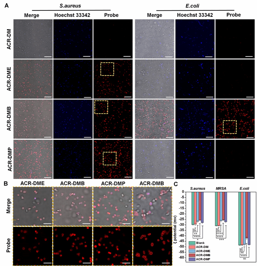 为了考察光敏剂作用位点,对孵育后的细菌进行荧光成像。发现ACR-DMB、ACR-DME和ACR-DMP均可与细菌质膜结合,改变了细菌的膜电位。