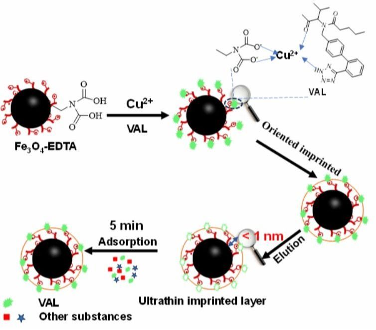 分子印迹聚合物(MIPs)是一种人工合成的材料,具有“人工抗体”的美誉,其依据专门设计的印迹腔,基于功能性和立体化学特性去识别目标分子或其结构类似物。由于其具有优异的选择性和特异性,已成功应用于分离提取、传感器、生物模拟催化剂、癌症诊疗等各个领域。然而传统分子印迹技术(MIT)存在制备成功率低,所得MIPs是印迹效率差、传质速率慢等。针对上述问题,本实验室在MIPs制备长期积累的基础上,提出利用配位键这一可逆共价键,制备具有超薄分子印迹层的新思路,开发了一种金属亲和定向表面印迹技术,成功制备出缬沙坦(VAL,分子量435.52,选择性抑制血管紧张素II受体1型的小分子药物,非传统分子印迹技术理想模板)MIPs。制备流程图如图1所示。首先,制备了乙二胺四乙酸修饰的磁性纳米颗粒(Fe3O4-EDTA NPs),然后依次加入金属离子Cu(II)和VAL。在金属离子Cu(II)的桥梁作用下,缬沙坦通过配位键固定在磁性纳米颗粒表面。随后进行聚合,洗脱模板分子之后,得到MIP(命名为MMIP),利用多种手段对其的形貌和吸附行为进行了表征。确证了所提出金属亲和定向表面印迹技术的可行性,为那些分子中含有配位官能团化合物的制备提供了一条新的路径。