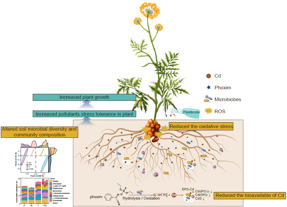 川芎(Ligusticum Chuanxiong Hort.)是我国川产道地药材,具有活血行气、祛风止痛等功效,广泛应用于心脑血管疾病的治疗。然而,随着工业化和农业活动的加剧,川芎主要种植区土壤面临严重的重金属镉(Cd)和农药辛硫磷(Ph)复合污染问题,不仅影响药材品质,还制约了其出口贸易。针对这一难题,beat365官网“资源与环境生物技术”团队通过从四川什邡市镉污染严重的川芎根际土壤中分离出一株耐Cd-Ph的功能菌株TS2(Halomonas),并以此为生物刺激剂,激活并优化土著微生物群落功能,最终构建了以芽孢杆菌(Bacillus)、不动杆菌(Acinetobacter)等为优势菌属的土著耐污染微生物联合体(RM)。
