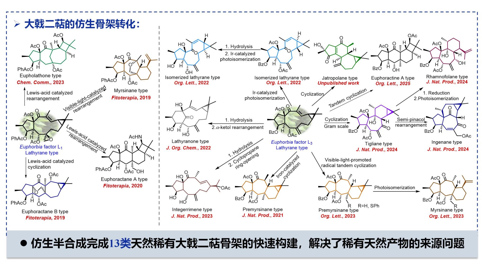 高峰教授团队近几年专注于天然稀有大戟二萜的仿生转化合成研究,以天然含量丰富的续随子烷型大戟二萜Euphorbia factor L1-3 (中药千金子中含量超过1.5%,结晶易得)为原料,应用金属/光催化天然产物骨架转化新策略,高效仿生半合成了13类天然稀有的大戟二萜骨架类型化合物,解决了来源问题,并进行后续活性评价研究。关于大戟二萜的化学和生物学工作,在Org. Lett., Chem. Comm., J. Org. Chem., J. Nat. Prod., Bioorg. Chem.等期刊发表论文20余篇。