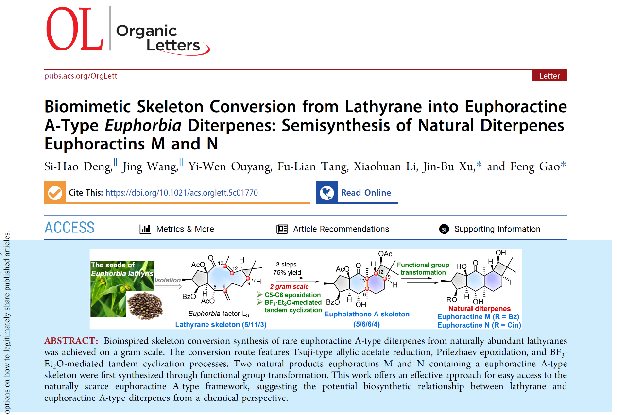近日,有机化学国际权威期刊《Organic Letters》(中科院1区TOP期刊,Nature指数期刊)上在线发表beat365唯一官方网站beat365唯一官方网站高峰教授团队的最新研究成果“Biomimetic Skeleton Conversion from Lathyrane into Euphoractine A‑Type Euphorbia Diterpenes: Semisynthesis of Natural Diterpenes Euphoractins M and N”。硕士研究生邓思浩和王婧为第一作者,硕士研究生欧阳艺文和唐博莲,以及李晓欢副教授参与该项工作,高峰教授和徐巾卜助理教授为通讯作者,beat365唯一官方网站是唯一通讯单位。