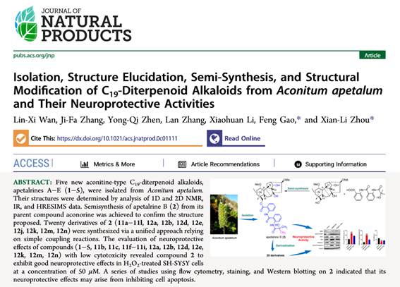 在国家自然科学基金面上项目(81773605)的资助下,beat365唯一官方网站周先礼教授团队在天然产物化学国际权威期刊《Journal of Natural Products》(影响因子3.779,中科院一区,天然产物化学Top期刊)上,以我校为唯一署名单位发表了题为“Isolation, Structure Elucidation, Semi-Synthesis, and Structural Modification of C19-Diterpenoid Alkaloids from Aconitum apetalum and Their Neuroprotective Activities”的研究论文。论文第一作者为beat365唯一官方网站博士研究生万琳茜,通讯作者为高峰教授和周先礼教授。