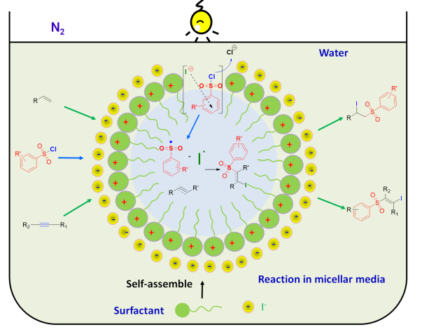 因此,受到他们课题组工作的启发,李加洪实验室利用阳离子表面活性剂CTAB在水中自组装形成胶束作为微反应器,在胶束中缺电子的磺酰氯作为电子受体,而富电子的卤素碘负离子作为电子给体通过阴离子-π相互作用形成有色的磺酰氯-卤素阴离子EDA复合物,在可见光条件下实现单电子转移,形成磺酰氯阴离子自由基,再进一步失去氯负离子后得到砜基自由基,然后和各种烯烃、炔烃发生原子转移自由基加成反应,制备了一系列β-碘代砜衍生物。他们还利用UV-vis吸收波谱法、定量核磁法、Job’s plot、 Stern-Volmer荧光淬灭实验等一系列的实验证实EDA络合物的存在。并通过控制实验、自由基捕获实验和光开关实验室验证了砜基自由基的存在。由于胶束效应,副产物被最小化,导致反应的高选择性。