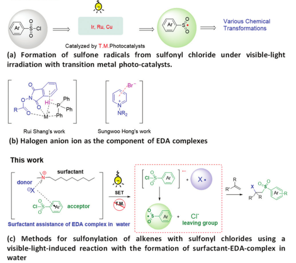 另一方面在有机合成中磺酰氯是获得砜基结构单元最常见试剂之一,然而在可见光条件下磺酰氯的裂解往往需要光催化剂特别是过渡金属催化剂(如Ir,Ru,Cu等)的催化作用才能形成砜基自由基(图1,a),并且这些方法都需要在有机溶剂中进行。这使得这些方法不仅不经济且不环保。因此,如何在室温条件下在绿色溶剂水中不用任何光催化剂就实现磺酰氯的裂解形成砜基自由基在绿色合成上具有重要的研究意义。最近利用形成电子供体-受体(EDA)络合物策略可以在无催化条件下实现可见光介导的有机反应。特别是卤素负离子已经有报道作为EDA复合物的电子给体,如尚睿课题组和Hong课题组的工作 (图1,b)。