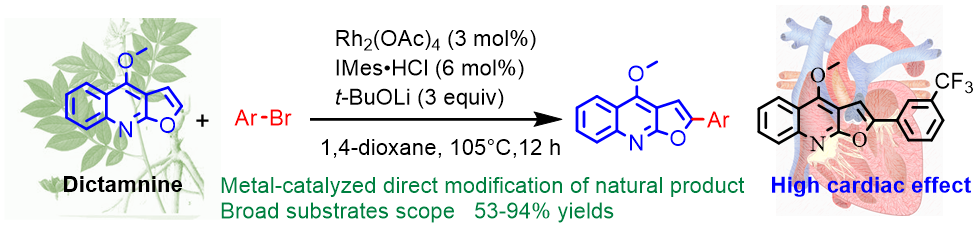 长期以来,我们团队对过渡金属催化的 C-H芳基化反应过程很感兴趣。呋喃[2,3-b]吡啶是天然产物和药物中重要的杂环支架,如白鲜碱、崖椒碱、吴萸春碱及茵芋碱等。本工作首次报道了金属铑和氮杂环卡宾配体催化呋喃[2,3-b]吡啶2位芳基化的方法学研究,合成得到15个呋喃[2,3-b]吡啶2位芳基化衍生物,并简单探讨了其反应机理。值得指出的是,该反应体系具有极好的化学选择性和官能团耐受性。