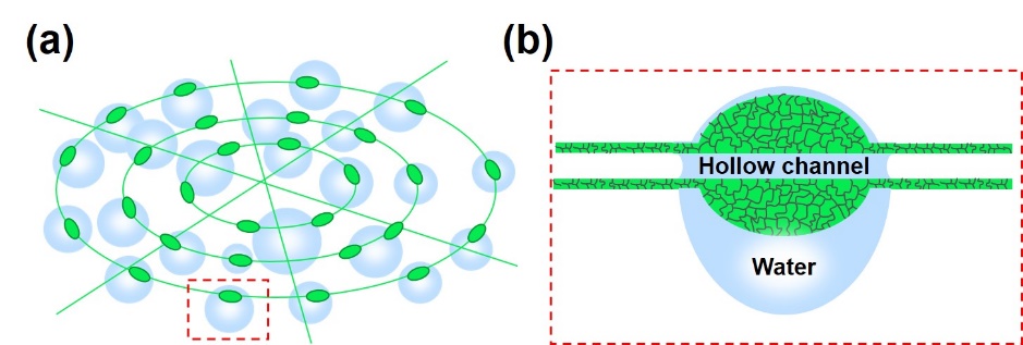 受天然蜘蛛丝集水行为的启发,孟涛教授等设计并制造了一种具有高效集水性能的中空纺锤节微纤维(图2)。这种形貌可控,具有连续中空通道的周期性纺锤节微纤维是基于微流控多相层流方法,利用双水相(ATPS)的分区特性所制备的。相比于实心纺锤节微纤维,中空微纤维展现出更加优异的液滴悬挂能力、定向输送、增长速度以及集水效率(图3)。