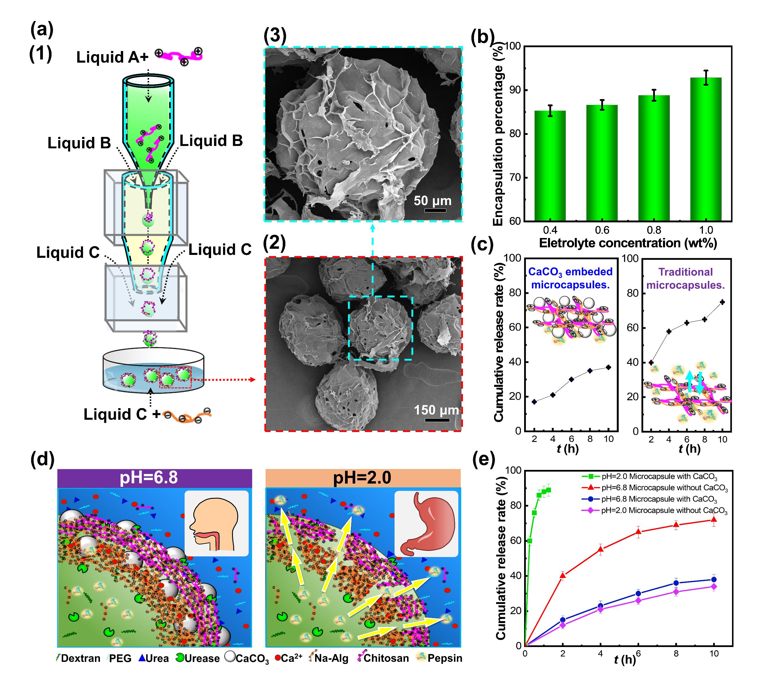 2 以碳酸钙颗粒稳定的全水隔室为模版构建药物递送微囊及其在生物活性物质包封、酸性环境药物释放的应用。