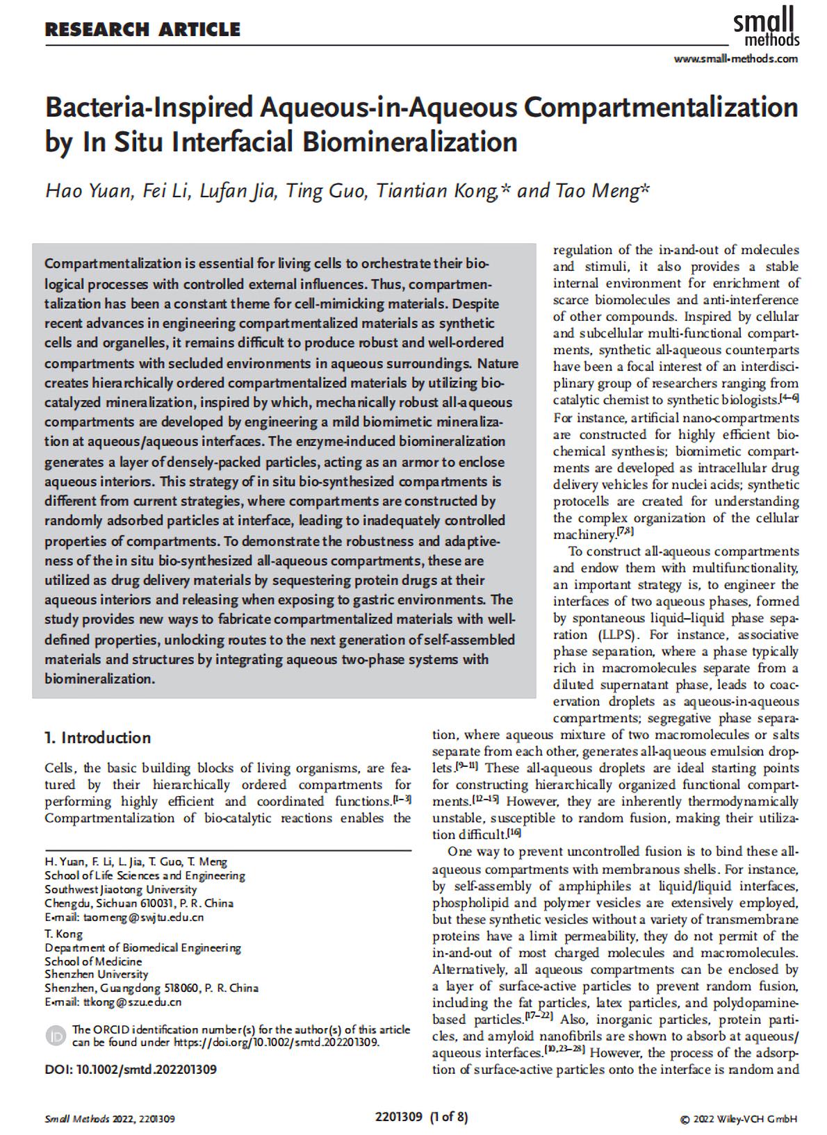 近日,国际生物医学、化学、物理学和材料学领域权威期刊《Small Methods》(影响因子15.367)报道了我校“微纳生物技术”创新团队孟涛教授的研究成果“Bacteria-Inspired Aqueous-in-Aqueous Compartmentalization by In Situ Interfacial Biomineralization”中文译名:“受细菌启发的全水隔室界面原位仿生矿化”(DOI: 10.1002/smtd.202201309)。论文第一作者为beat365唯一官方网站苑昊老师和2018级硕士研究生李飞,通讯作者为深圳大学生物医学工程学院孔湉湉副教授和beat365唯一官方网站beat365唯一官方网站孟涛教授,beat365唯一官方网站为第一署名单位。