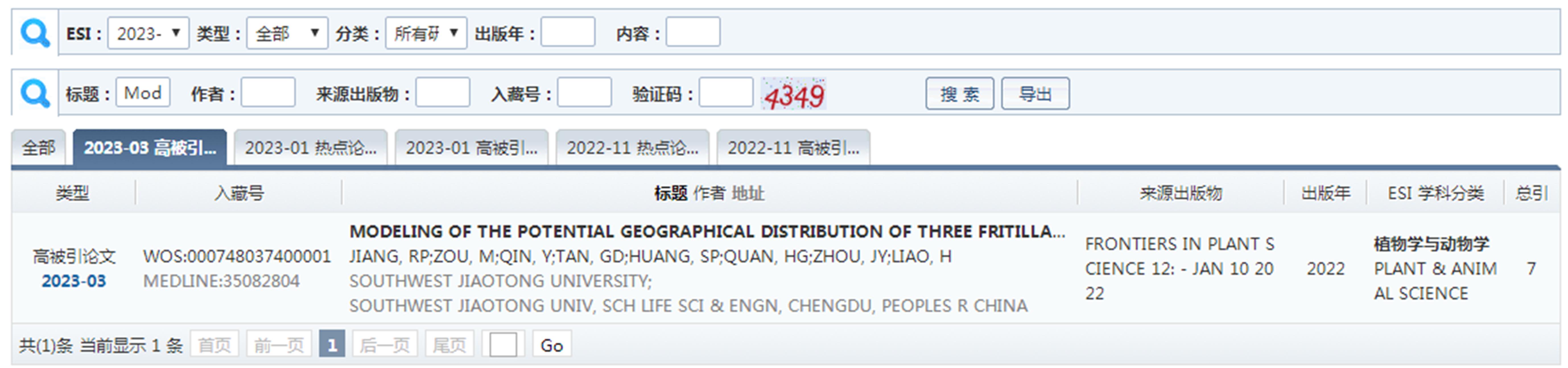 近日,根据最新Web of Science ESI最新公布的数据显示,beat365唯一官方网站beat365唯一官方网站周嘉裕、廖海副教授在植物学国际期刊《Frontiers in Plant Science》上发表题为“Modeling of the Potential Geographical Distribution of Three Fritillaria Species Under Climate Change”的研究型文章成功入选ESI高被引论文。《Frontiers in Plant Science》是植物学领域内最具影响力和权威的期刊之一,该刊目前为JCR分区和中科院分区双一区TOP期刊。