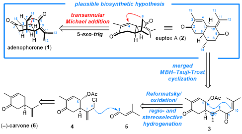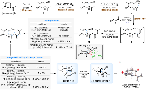 在生源途径推测过程中,作者分析天然产物(+)-euptox A(2)可能是(−)-adenophorone的重要生物合成前体,转化的关键则在于(+)-euptox A的C4位和C8位环合后可形成(−)-adenophorone核心骨架结构。故受生源合成推测的启发,在仿生逆合成思路中(图2),作者希望通过从商业可得的(−)-carvone(6)出发,通过Reformatsky/氧化/区域和立体选择性氢化、MBH-Tsuji-Trost环化等反应实现生源前体(+)-euptox A的合成,在此基础上再经跨环Michael加成高效简洁地完成(−)-adenophorone的仿生构建。