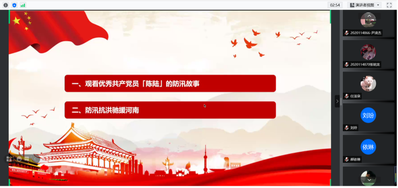 会议伊始,曾旭东同志带领大家观看了优秀党员陈陆的防汛故事,视频讲述了陈陆同志在抗洪抢险中不顾自身情况,坚持在一线进行救援工作,最终被淹没在了洪水中的英雄事迹。把党和人民放在第一位,是共产党员一直以来所秉持的行为准则,也正是先辈们如此无私的行为,才使得红色基因被一直传承下来。