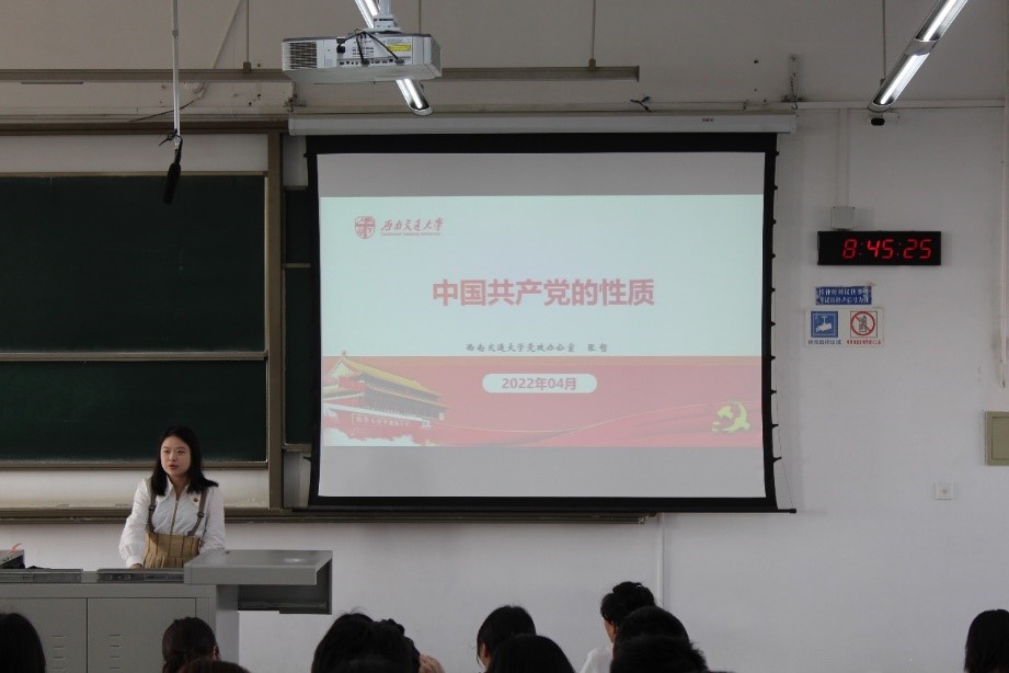 张哲老师以“中国共产党的性质和宗旨”为题,从“中国共产党是工人阶级的先锋队”“中国共产党是中国人民和中华民族的先锋队”和“中国共产党是中国特色社会主义事业的领导核心”三个方面系统地讲解了中国共产党的性质。神圣庄严的入党誓词响起,同学们肃然起敬,在心中默默跟念:我志愿加入中国共产党……没有共产党就没有新中国,中国共产党是中国特色社会主义事业的领导核心,在瞬息万变的局势中,在动荡不安的世界上时刻保卫我们的安全,关心民生大事,引领新中国走向繁荣复兴,在中国特色社会主义的道路上越走越远。