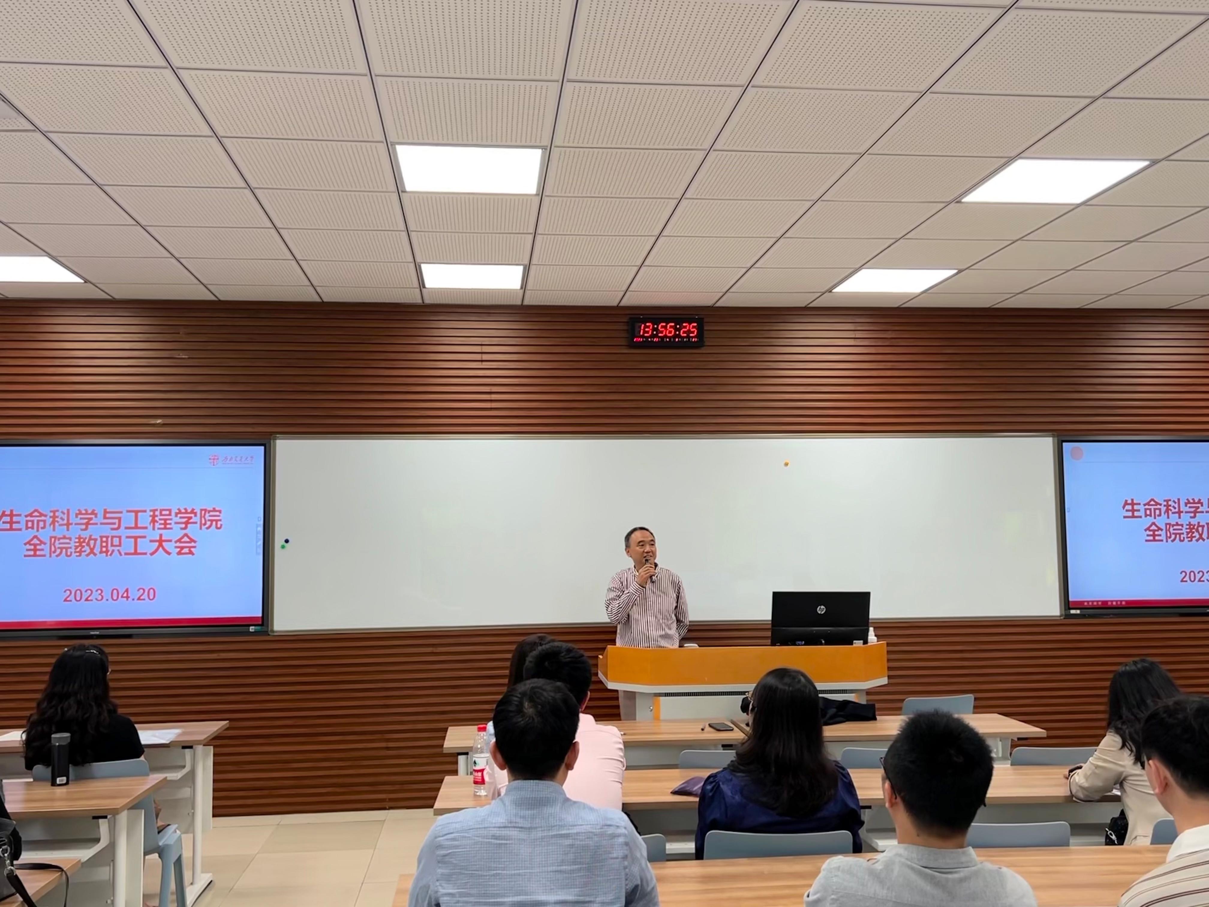 2023年4月20日13:30,beat365唯一官方网站在犀浦校区1201召开全院教职大会,学院领导班子成员和全体教职工出席大会。会议由学院党委书记李卓慧主持。