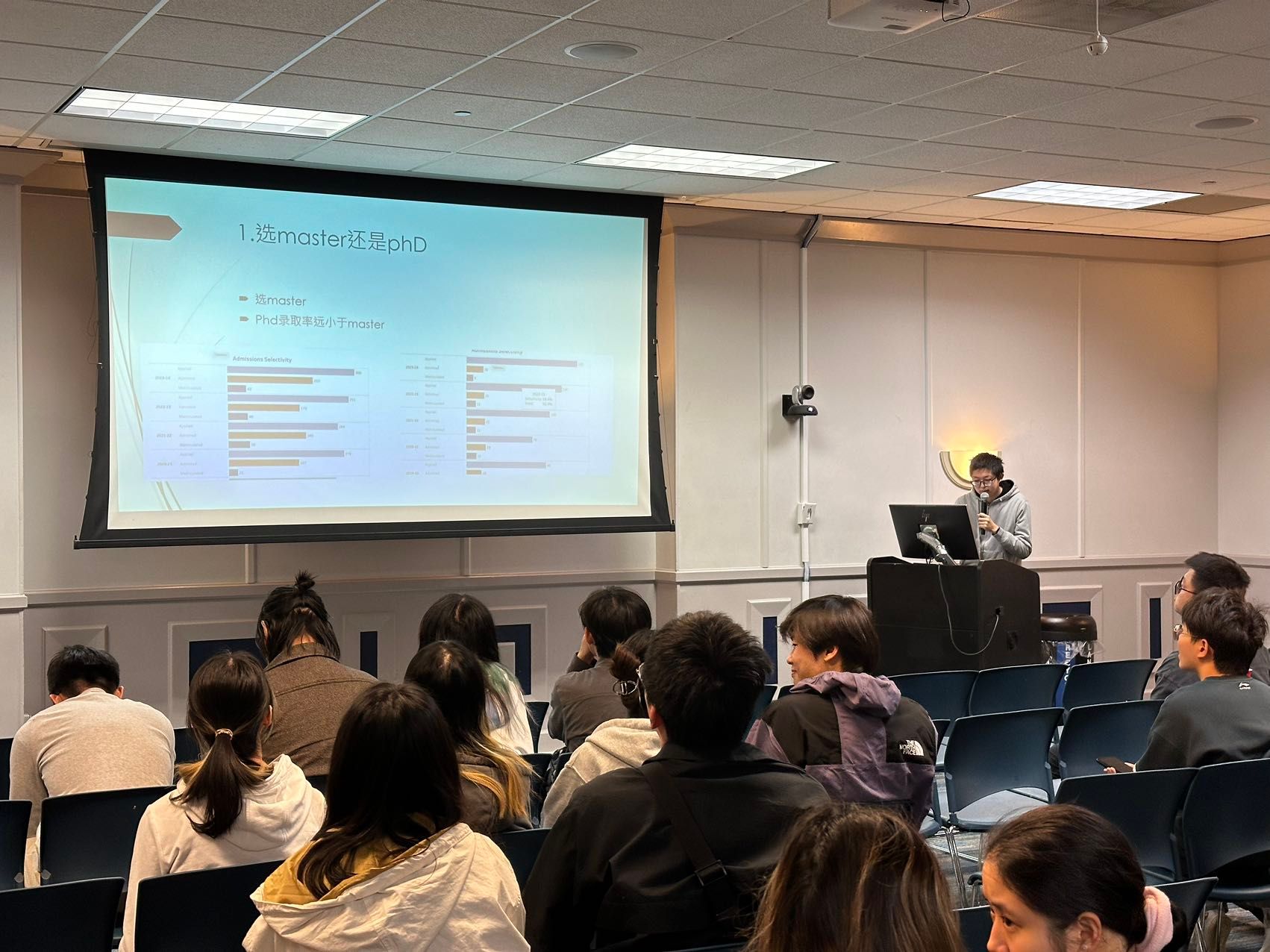 活动于3月31日下午1点在Student Center West,460,462房间举行,席间,多位学长学姐踊跃分享,2021级的同学们积极提问,最后Hongmei Zhang老师进行总结,并鼓励同学们行动起来进行申请准备。