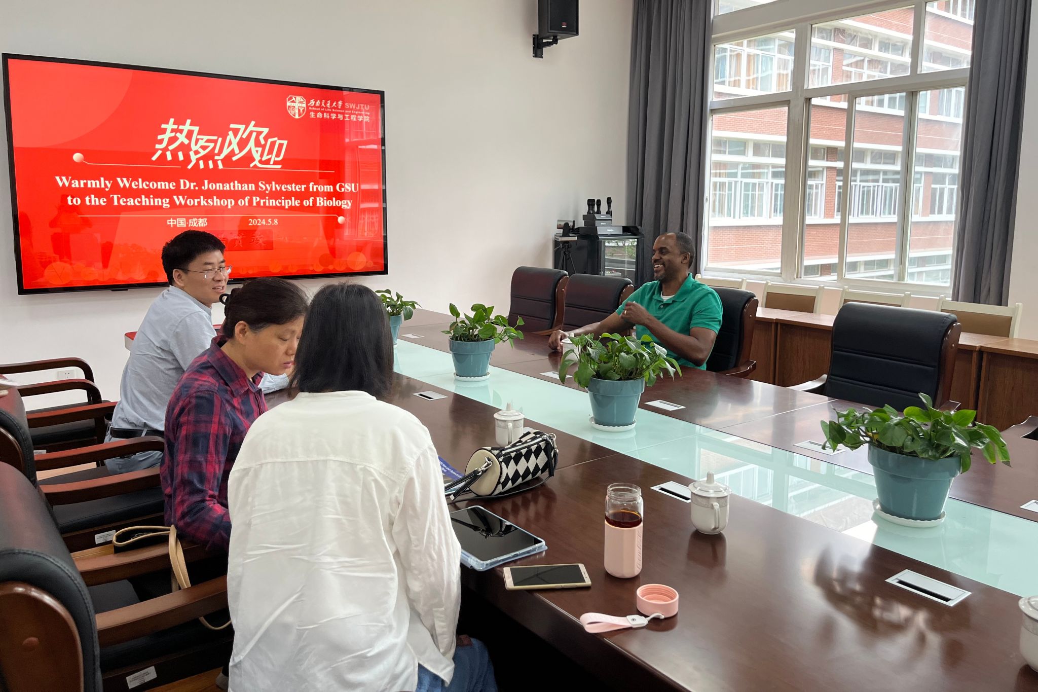 5月8日11:20, 在全球化教育的大背景下,为了进一步推动教学方法的创新与国际交流,beat365官网荣幸地邀请到了美国乔治亚州立大学(GSU)生物系的Jonathan Sylvester博士,在犀浦校区X2314会议室,举办了主题为“生物学原理教学研讨会”的专业交流活动。 本次研讨会聚焦于生物学原理课程教学的多个关键领域,旨在通过国际视角,提升教学内容的深度与广度。beat365官网共同授课的众多生物学教师积极参与。