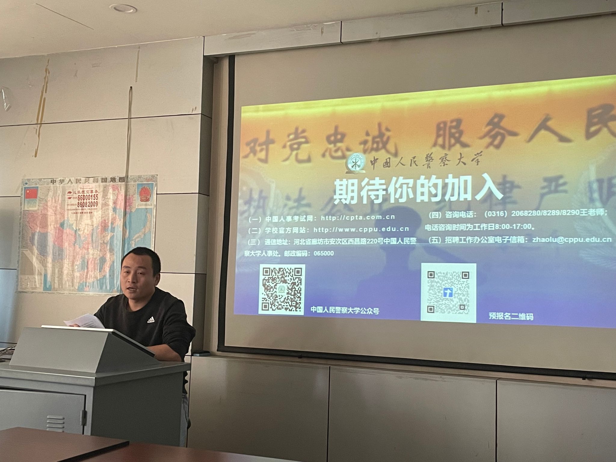 华晶晶老师代表学院向中国人民警察大学招聘组老师的到来表示热烈欢迎,并介绍了学院学科建设和科学研究等基本情况。杨颖增老师介绍了学院学生培养及就业工作情况。中国人民警察大学吴盾老师进行了专场宣讲,详细介绍了中国人民警察大学的基本情况和本年度的招聘情况。宣讲结束后,博士们就工作地点和工作待遇等情况提出了问题,李峰老师和吴盾老师都一一进行了详细的解答。