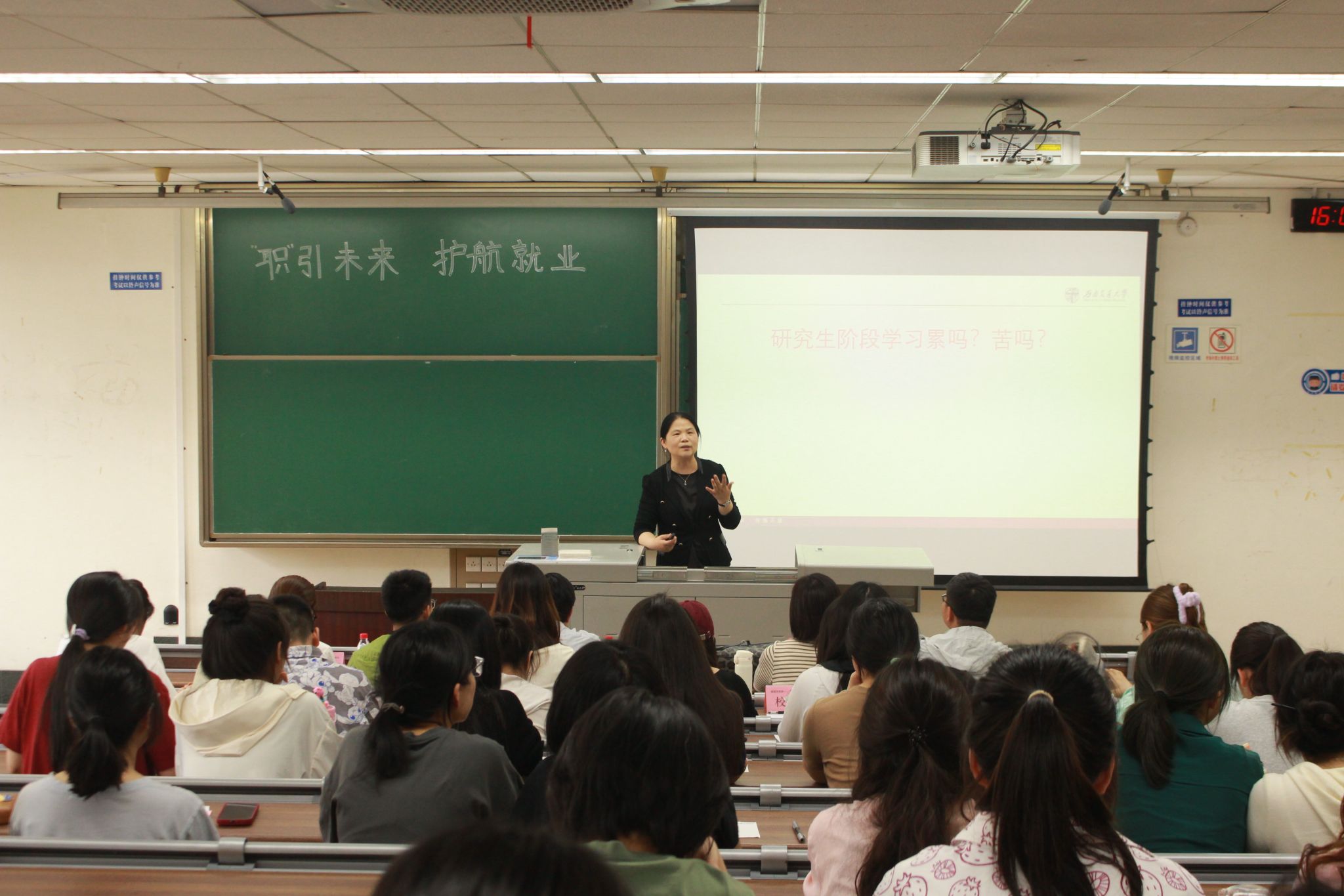 讲座伊始,黄春蓉书记与同学们互动交流了读研的感受,表示研究生阶段不仅是知识的积累,更是一段心路历程的挑战。她指出,在研究生生活中常伴随着学业压力、人际关系、未来不确定等问题,克服这些困难的关键就在于保持初心。她鼓励同学们要坚定自己的目标和信念,在面对困难时保持乐观积极的态度,勇敢面对挑战,不断提升自我,最终实现自己的人生价值。黄书记提醒同学们要学会找准自己的职业定位,比如在组织中的六大职能工作包括产品研发、生产技术、市场营销、资本财务、人力资源、行政管理,定位职业目标才能更好发展自己且有利于找到心仪的工作。