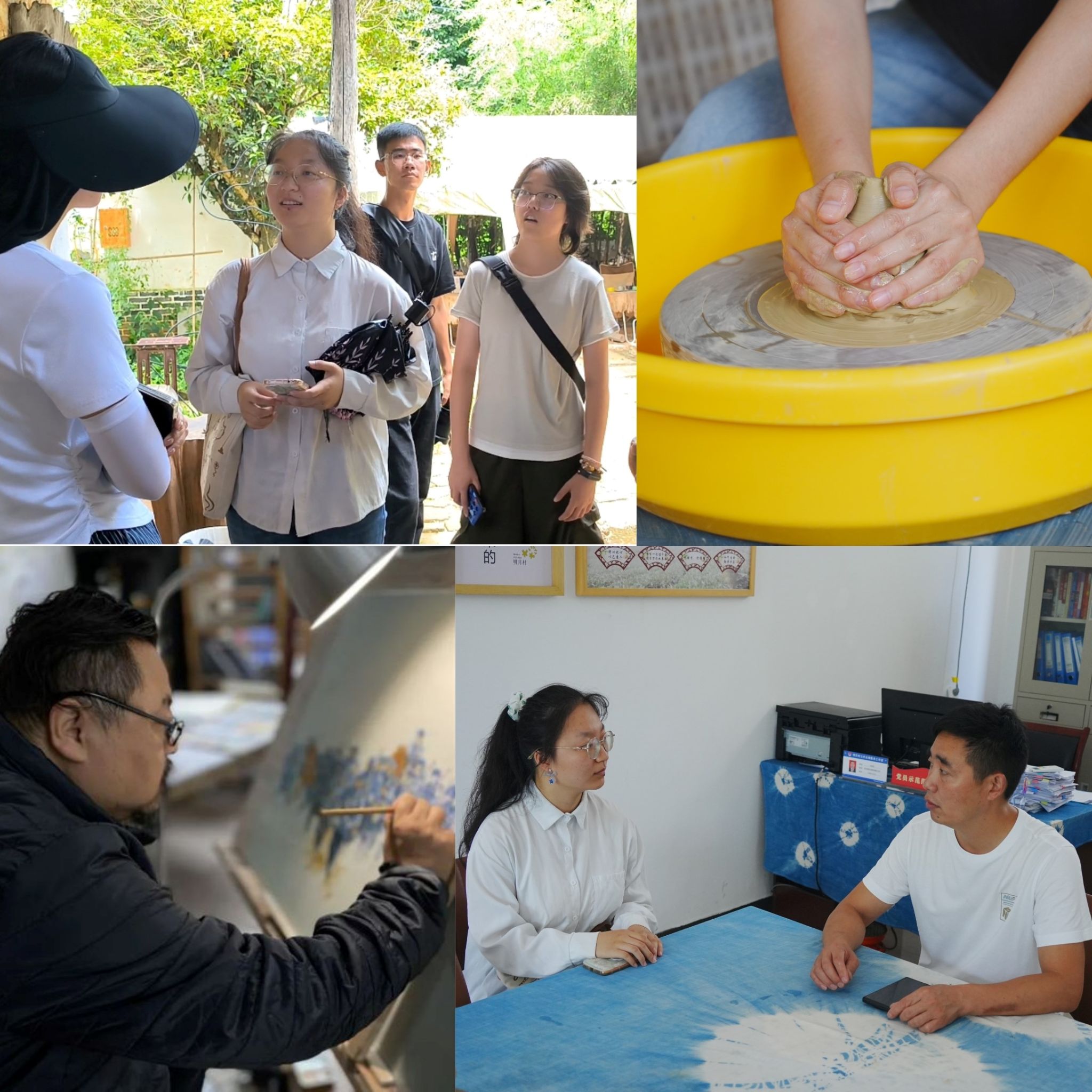 实践期间,队员们采访了明月村党支部吴俊江书记,了解到明月村如今整体发展现状:明月村主要产业特色可概括为“茶山、竹海、明月窑”,依托3000余亩生态茶园,8000余亩雷竹,4口古窑等资源,同时引进多种文化项目和多名艺术家、青年创客,形成了以陶文化为主的文创项目聚落和文化创客集群。吴书记还提到,期望大学生通过实地考察后,能够对明月村的不足提出实质性建议,为明月村的乡村发展贡献青年力量。随后,在讲解员的带领下,实践队先后调研了蜀山窑陶瓷艺术博物馆、书画篆刻博物馆、蜡染工坊等明月村特色文创项目,随处可见的艺术元素,无一不让人切实感受到明月村的文化底蕴。