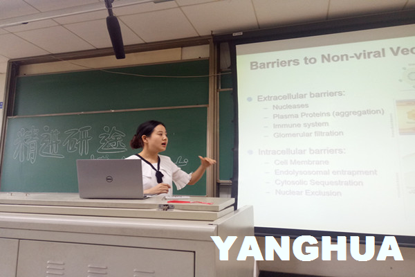万瑜从“基因治疗的历史”“基因治疗的现状与限制”“成功与失败案例分析”三个方面为大家进行了专业讲解。她着重介绍了基因治疗的药物如何穿过细胞膜从内吞体内逃逸出来,并强调构建以peptide为基础的基因药物传送系统与研究导向肽在基因治疗中的作用的重要性。此外,她还与大家分享了澳洲的求学经历,除了专业知识的汲取,她也经常参加相关学科领域的学术研讨会,学校举办的音乐会与戏剧活动等。通过参加这些活动,不仅开阔了她自己的学术视野,也结交了一群志同道合的挚友。