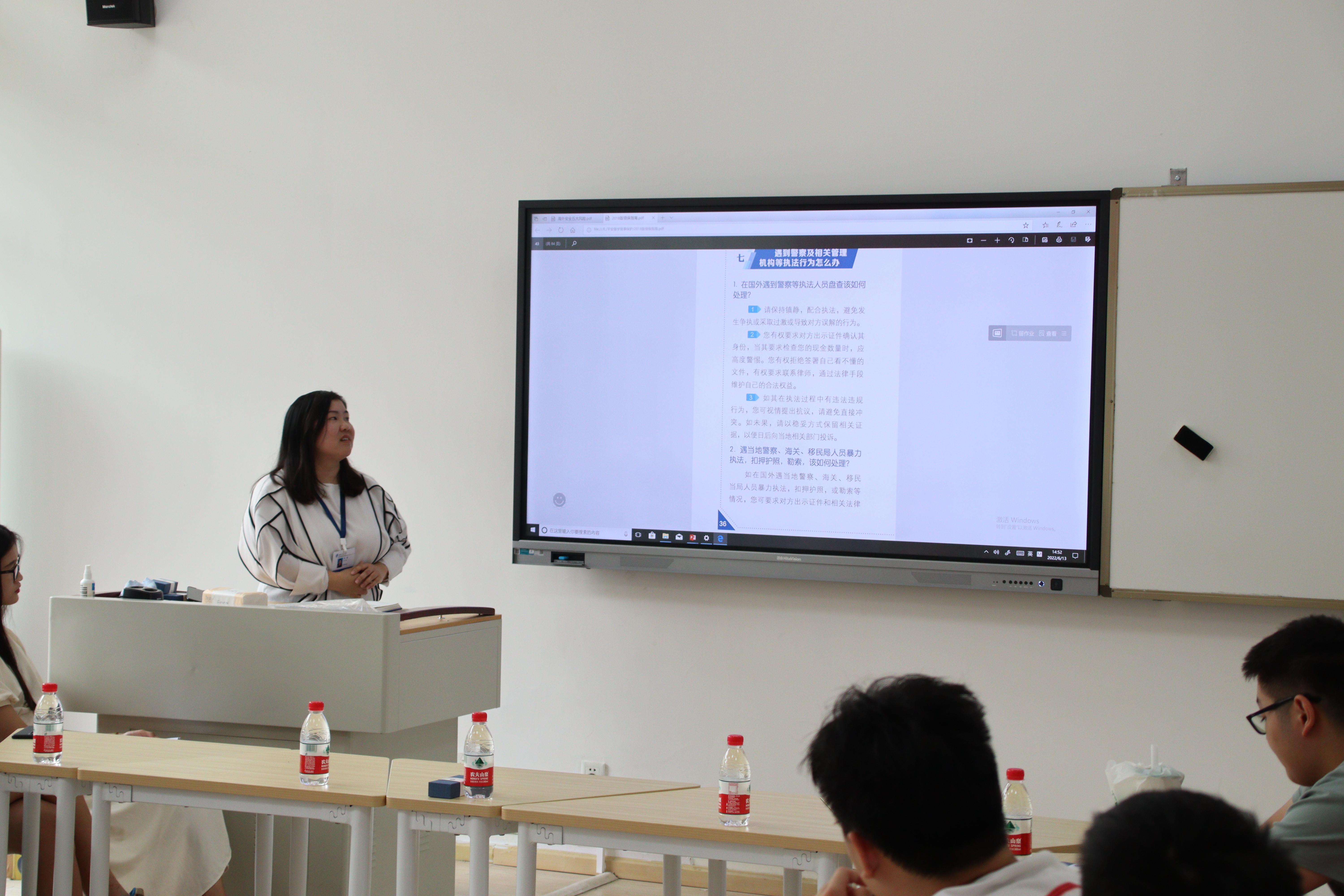 国际处刘涵老师从领事保护和境外安全两个方面向同学们做出国留学行前培训。她向同学们介绍了领事保护的相关渠道及境外遇到困难维权和解决的途径,重点讲解了海外安全的五大风险,例如交通安全,财产安全和人身安全等。她补充强调了留学生在面对一些突发状况时的应对措施,提醒同学们注意自己的电子邮件,及时了解学校发布的相关信息,防范境外电信诈骗等。