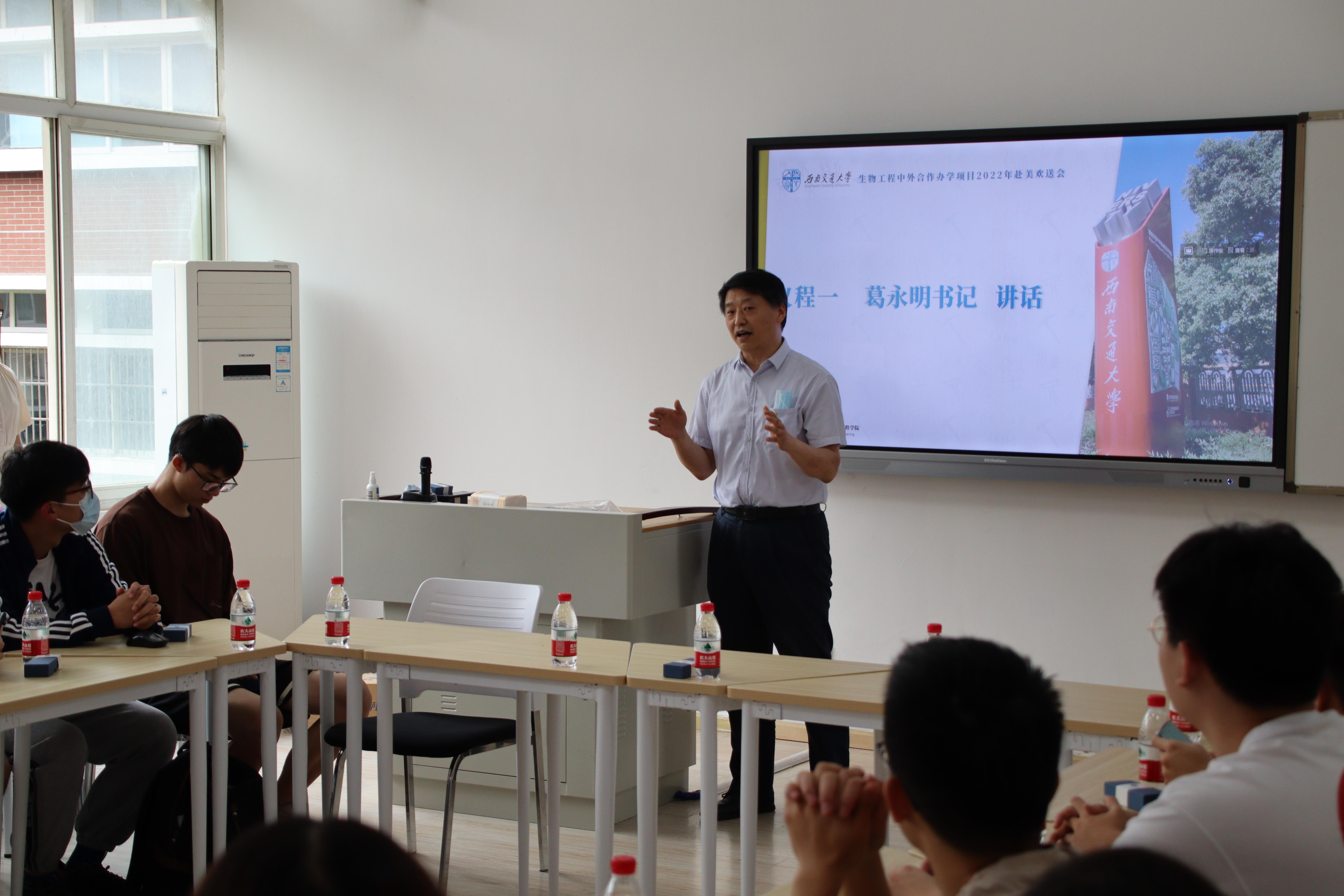 葛永明书记代表beat365唯一官方网站致辞。他表示,学校对中美班高度重视,为中美班的同学提供了优质的师资和良好的办学条件,学院为了同学们能够顺利出国也做了大量的工作,希望同学们珍惜出国留学的机会,努力学习报效祖国。葛书记对赴美同学两年来的学习给予肯定,对即将赴美学习深造表示祝贺,也预祝大家未来学习与生活中能快乐和顺利。在不断迈进第二个一百年奋斗历程之际,他希望同学们应该在当下努力学习,不负韶华,未来为祖国、为人民,为中华民族伟大复兴贡献自己的一份力,用奋斗去架起成功的桥梁,用拼搏去书写人生华美的篇章。同时也表示同学们应该牢记社会主义核心价值观,身为新时代的新青年应该把爱国作为自己最重要的一个使命。他强调,目前疫情形势和国外环境复杂,在出国过程及未来学习生活中应该注意疫情防护,保障人身安全。