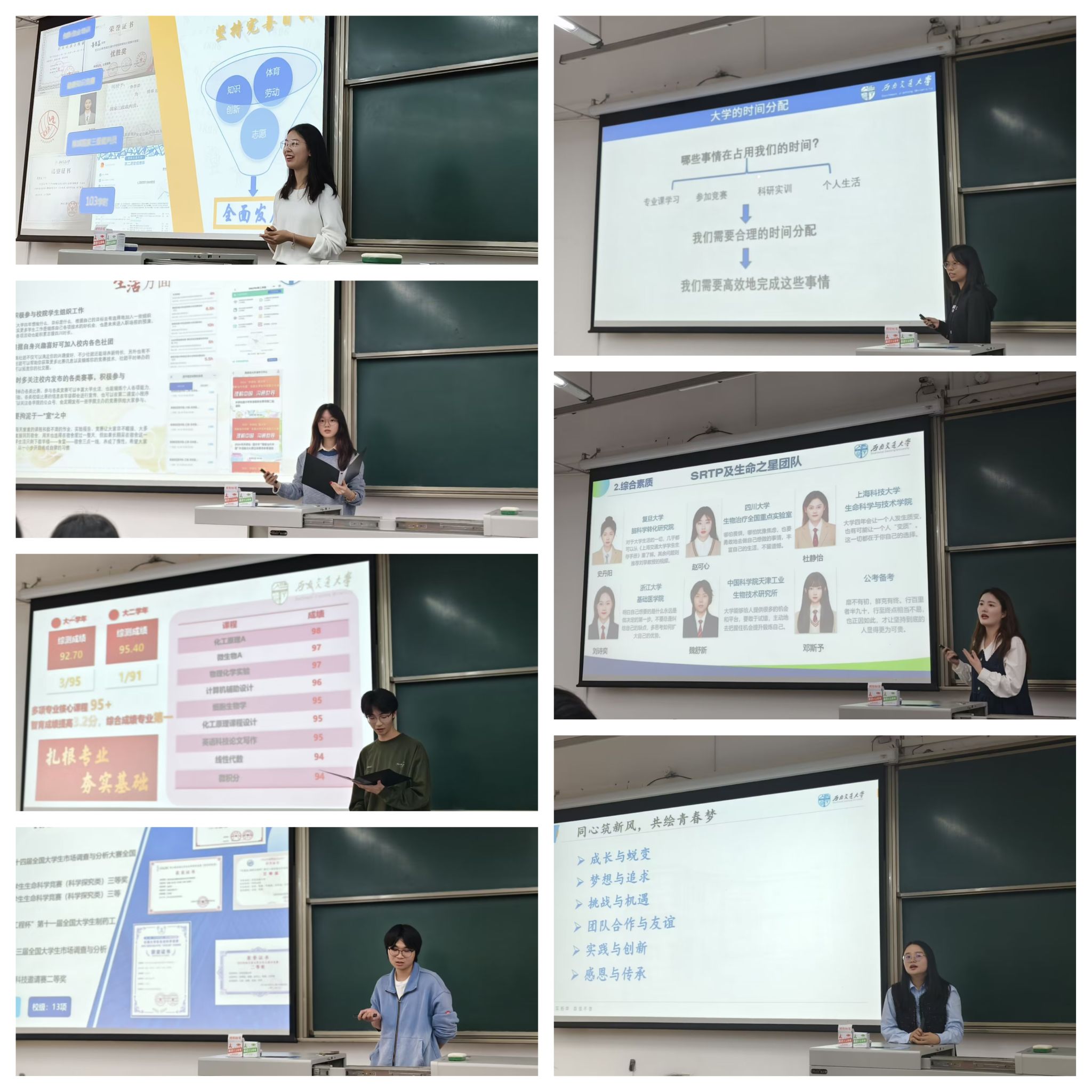 分享会开始,杨颖增老师表示举行本次分享会的目的是希望2024级本科生们能够积极向高年级的优秀师兄师姐学习,在学习中不断提升自我,弘扬“竢实扬华,自强不息”的交大精神。随后,分享会的嘉宾们按照年级顺序依次上台分享学习经验。学院青年讲师团成员鲁晋嘉同学强调了上课专注和克服惰性的必要性,只有保持高度的学习热情和自律精神,才能在学业上取得优异的成绩。学院青年讲师团成员余沐萱同学分享了她对于合理规划时间和勇于试错的独到见解,她认为时间是宝贵的资源,必须精打细算;同时,勇于尝试新事物,不怕失败,才能在校园生活中不断突破自我。学院青年讲师团成员朱芮豪同学聚焦于“踏出第一步”的重要性,他鼓励同学们积极参与科研竞赛,要勇敢地迈出第一步,不要害怕失败和挫折,因为每一次尝试都是成长的机会。学院青年讲师团成员陈晨同学分享了参与科研项目的经验、对生物专业的认识和前沿科学的认识,并让同学们明确自己在未来的发展道路。学院青年讲师团成员洪美莹同学和学院青年讲师团成员王嘉莉同学的分享共同强调了在做科研项目时,耐心与毅力是不可或缺的宝贵品质。最后,学院2012级本科生、2016级硕士研究生、2017级博士研究生、2024年新入职青年教师,学院青年讲师团成员甄泳棋老师以其深厚的学术底蕴和丰富的实践经验,深刻阐述了团队合作、实践创新以及明确目标在实现个人成长和梦想追求中的重要地位。