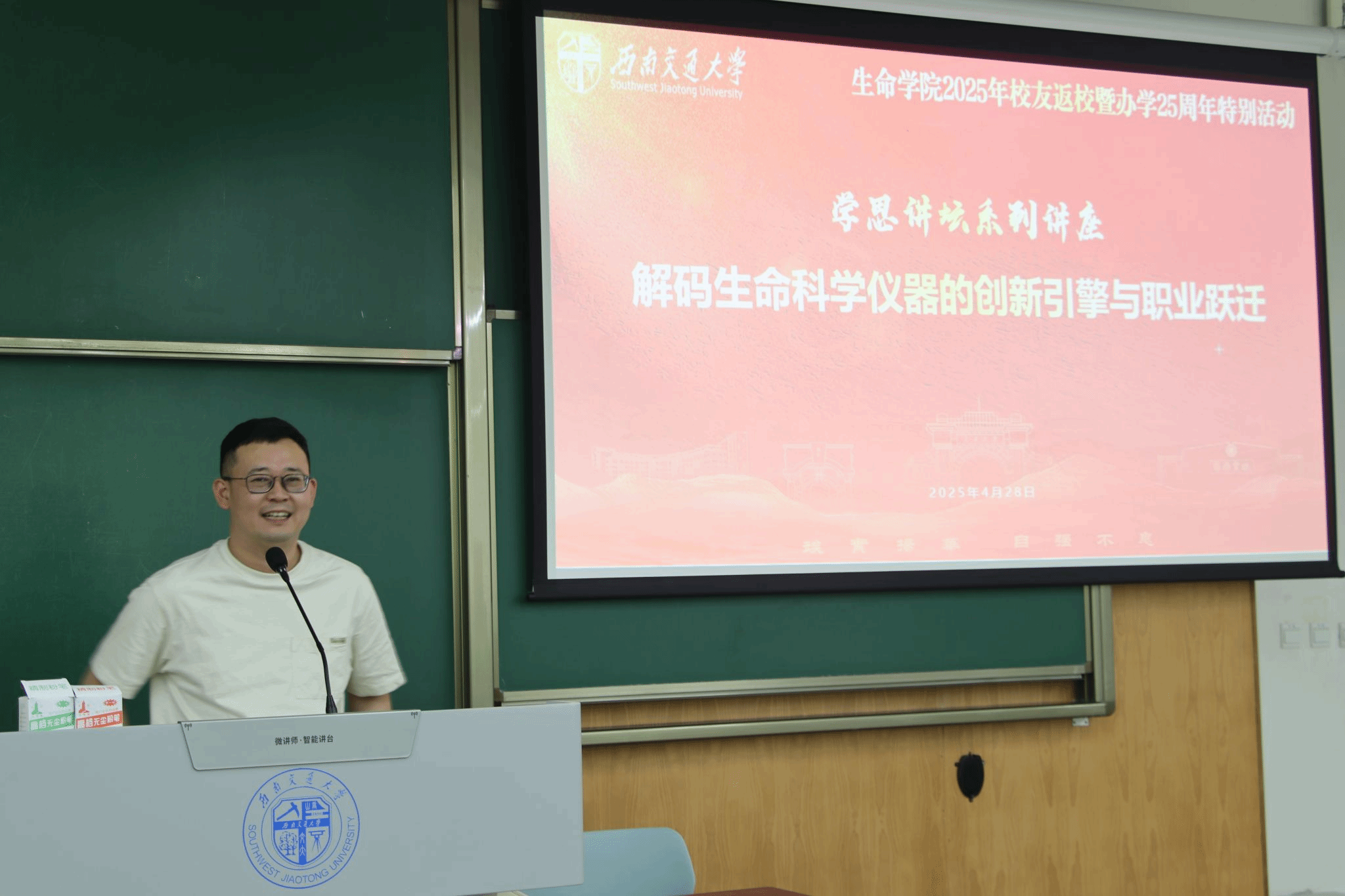 学院2011级校友、成都雄毅科技有限公司总经理贾文武作为主讲嘉宾,深入剖析生命科学仪器领域创新技术的核心驱动力与前沿趋势。他以个人职业生涯发展的四个阶段为脉络,分享了生物医药行业的从业经验,鼓励在校生注重跨学科知识整合与实践能力培养,在生物医药创新链条中找准个人价值定位。