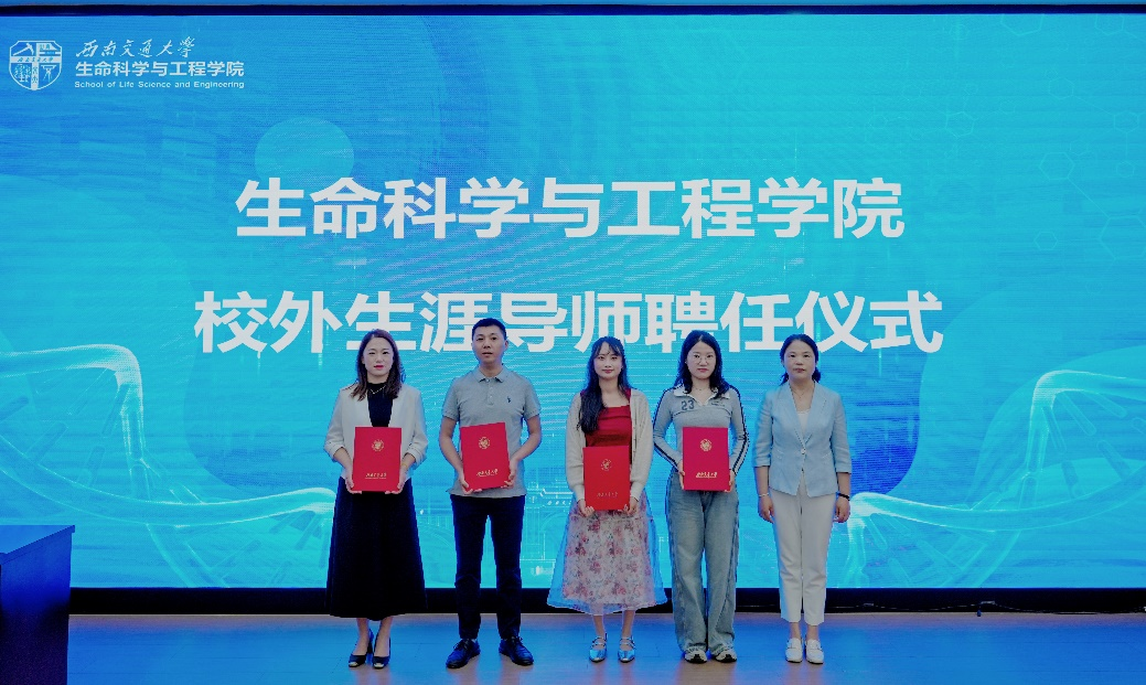 学院党委书记黄春蓉为李佩、魏国清、夏林、马仕英等校友代表颁发“校外生涯导师”聘书,期望校友们在各自岗位上拼搏奋进,勇创佳绩,期待与校友继续深化合作,完善学院"产学研创"协同育人体系,共同开拓生命科学领域创新发展新格局。