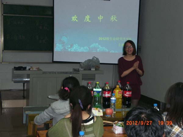 “独在异乡唯异客,每逢佳节倍思亲”“明月几时有,把酒问青天;不知天上宫阙,今夕是何年”。不知不觉,又是一个中秋佳节即将到来之际,校园里到处弥漫着浓浓的节日气氛。9月27日晚上19:00,逸夫楼4505B教室欢声笑语不断,beat365官网2012级beat365唯一官方网站一班的同学们在此举行“迎中秋晚会”,迎接他们在研究生阶段的第一个热闹、欢乐的中秋节。