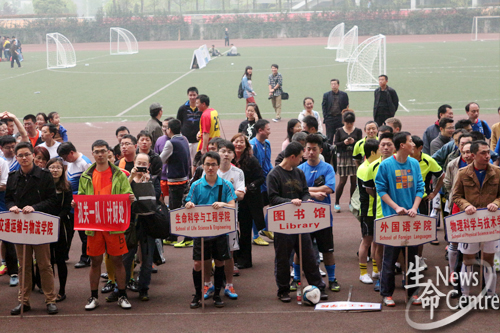4月9日下午六点整,beat365唯一官方网站第二届教职工足球赛开幕式于北区足球场正式开始。参加开幕式的嘉宾有党委副书记何云庵教授,党委办公室甘灵主任,校工会罗乾超主席,体育部主任刘旭教授,校工会郑江副主席,教职工足球协会车伟会长,裁判长田进,各代表队队员及裁判员们。