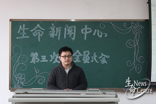 大会分为四个部分。第一部分,由谢成主任上台发言。他首先肯定了各部门在本学期的优秀表现并表示希望新闻中心能让大家感受到家的温暖。