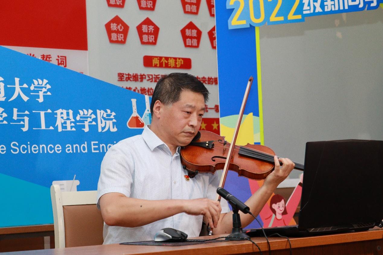 葛永明老师以《勤学、修德、明辨、笃实——扣好人生第一粒扣子》为题进行授课。优雅而又浪漫的琴声中饱含着葛永明老师对新生浓重的爱意和殷切的希望,他以习近平总书记写给青年朋友的信为切入点,号召全体新生高举团旗、跟党走,要践行“勤学、修德、明辨、笃实”的“八字方针”,谨记“志存高远、德才并重、情理兼修、勇于开拓”的“十六字要诀”,扣好人生第一粒扣子。通过展示中国共产党最新党员人数和青年党员的高占比,以及在抗疫中党员同志们做出的卓越贡献和无私奉献精神,他鼓励大家积极向党组织靠拢,并以此严格要求自己,成为一名合格的大学生。