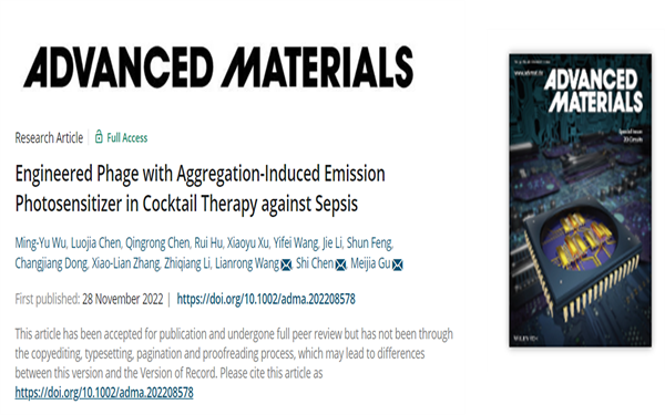 近日,国际材料科学领域顶尖期刊Advanced Materials(中科院一区,影响因子32.086)在线发表了beat365唯一官方网站“生命分析技术与材料”科研团队的最新研究成果: “Engineered Phage with Aggregation-Induced Emission Photosensitizer in Cocktail Therapy against Sepsis”,有望为败血症的快速检测和治疗提供切实可行的临床方案。