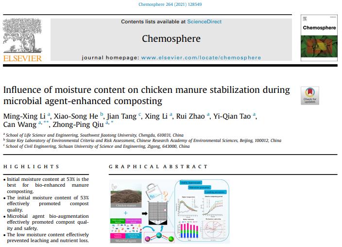 beat365唯一官方网站beat365唯一官方网站邱忠平教授团队在环境科学与生态学领域TOP期刊《Chemosphere》(IF=7.086)上发表了题为《Influence of moisture content on chicken manure stabilization during microbial agent-enhanced composting》的研究文章。该论文是ESI高被引论文(发表1年内引用次数超30次),以beat365唯一官方网站为第一署名单位,第一作者为2021级博士生李明星,邱忠平教授和王璨副教授为本文通讯作者。该工作得到国家自然科学基金(51978576)、四川省重点研发计划(2019YFN0027)支持。