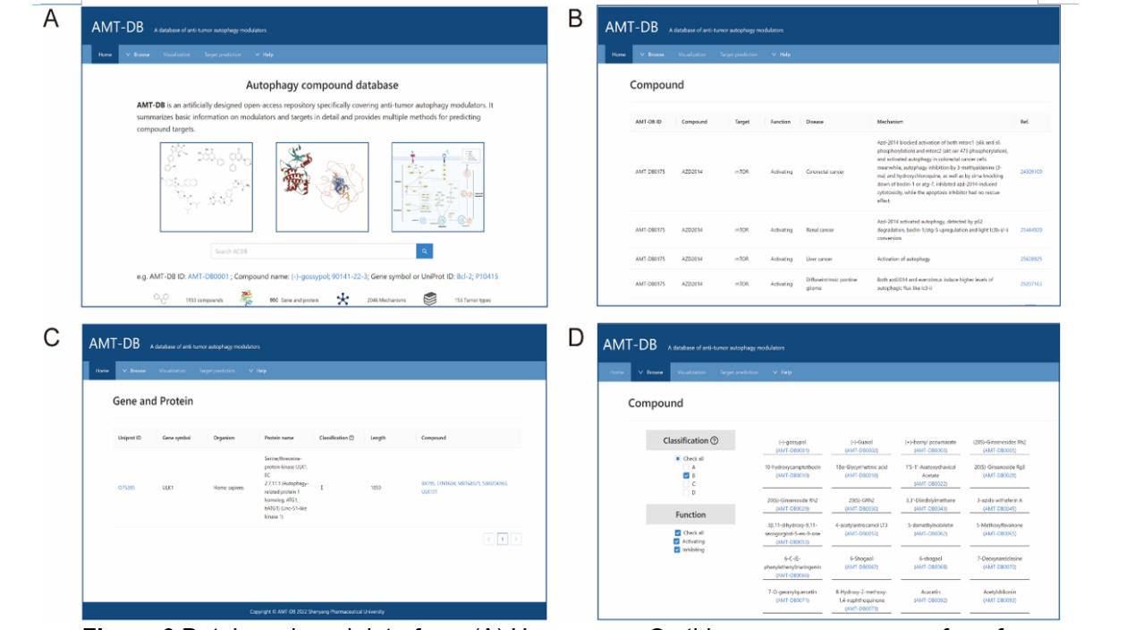 为了实现这一目标,符雷蕾研究小组合作开发了一个自噬调节剂综合数据库(AMTDB,https://amtdb.vercel.app/)。 AMTDB包括153种癌症类型,1153种调控自噬的化合物,860个靶点和2,046个相关机制或信号通路。此外,还提供了多种分类方法、高级检索和目标预测功能,以满足用户的不同需求。