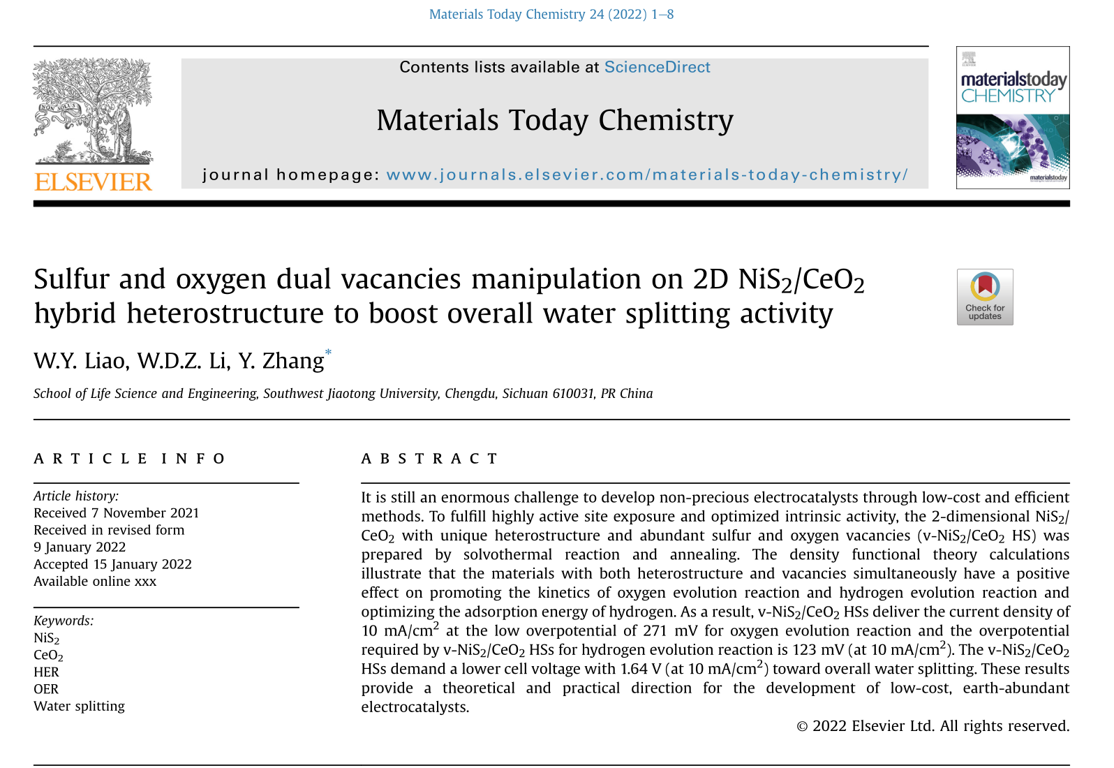 beat365官网张颜老师在化学领域TOP期刊Materials Today Chemistry发表最新研究成果